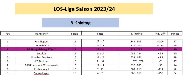 Die Volleyballer der SG Hangelsberg 47 e.V. belegen derzeit einen guten 3.Platz. Der nächste Spieltag findet am 20.02.2024 in Tauche statt.
